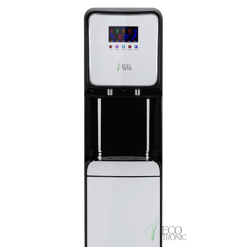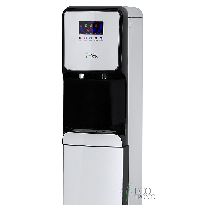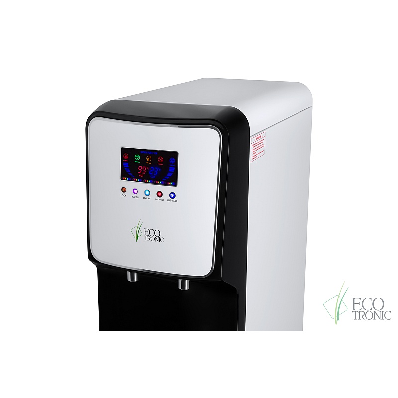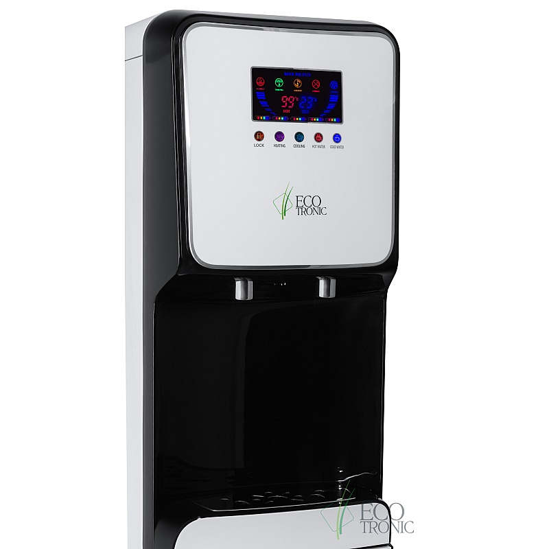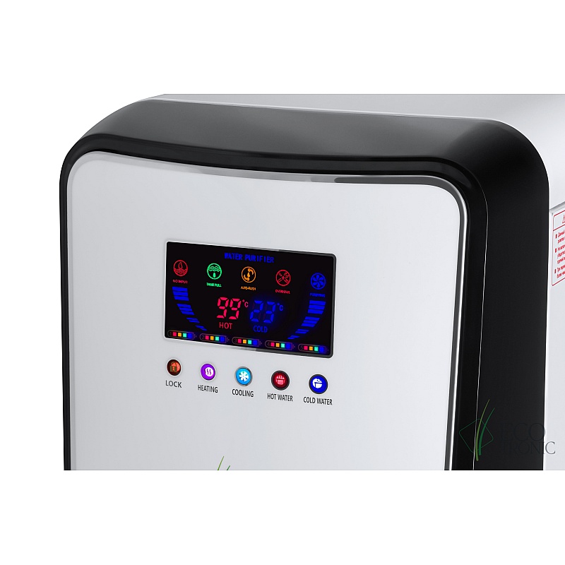 Аппарат оснащен цветным светодиодным дисплеем, который обеспечивает удобное управление и индикацию температуры воды. Дисплей также показывает срок службы фильтров, что позволяет своевременно производить их замену. Имеет два крана для подачи воды - холодной и горячей, причем для подачи воды используются сенсорные кнопки, что обеспечивает гигиеничность использования. Оборудован защитой на кране для горячей воды, что обеспечивает безопасность использования.
