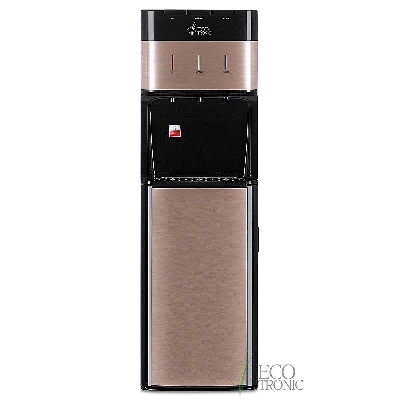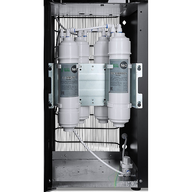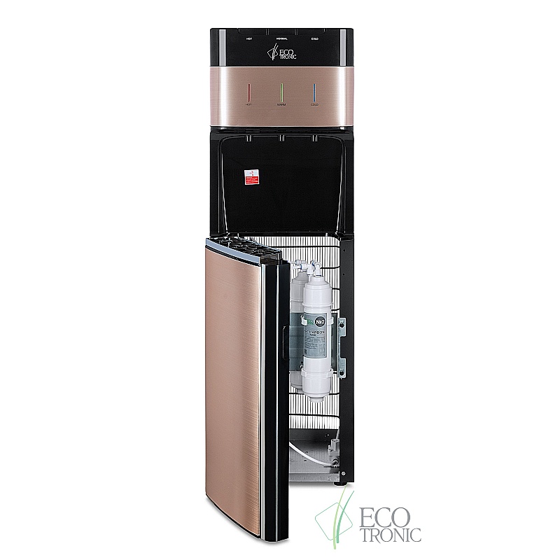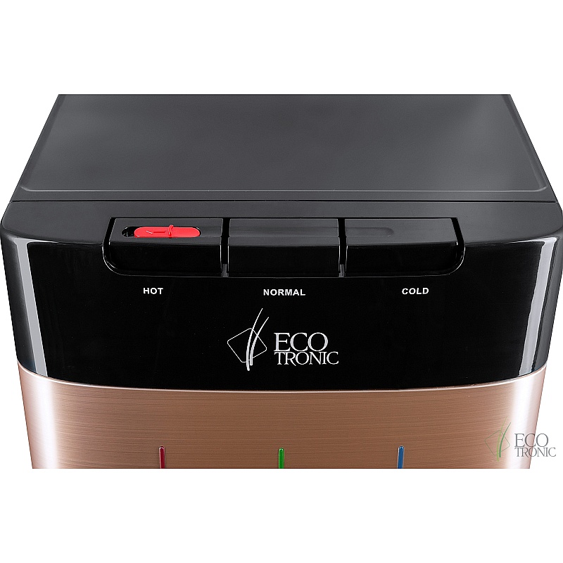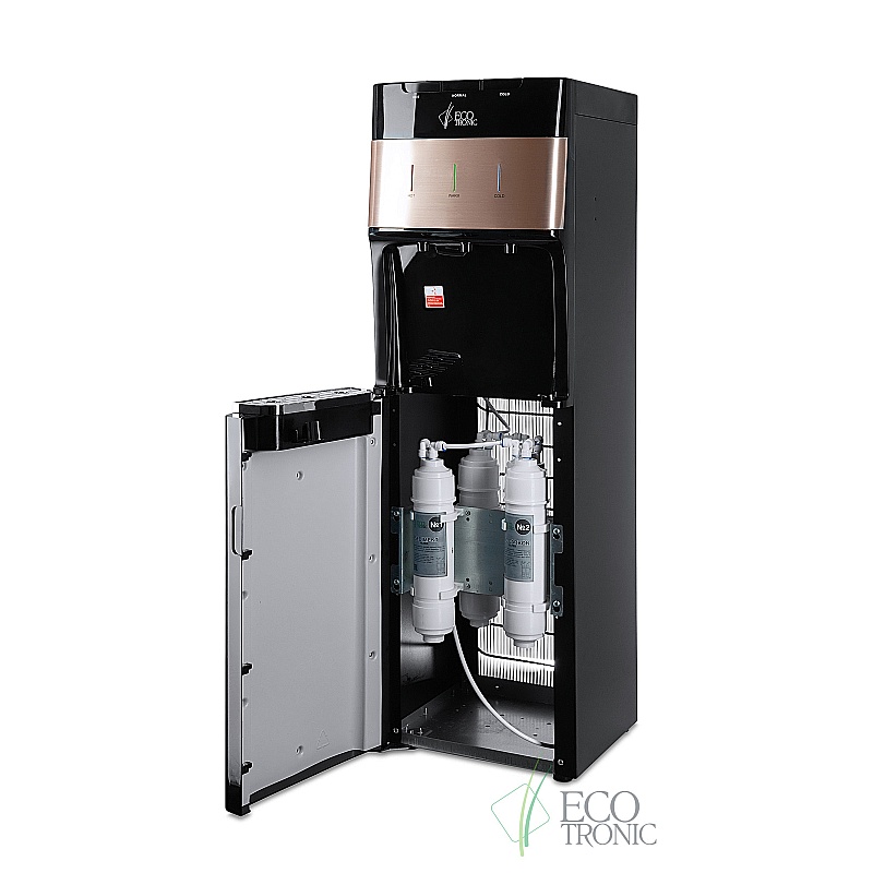 Пурифайер с системой очистки воды методом ультрафильтрации и компрессорным охлаждением. Корпус черного цвета со вставкой в золотых тонах. Три клавиши подачи воды: горячая/комнатной температуры/холодная. Защита от ошпаривания. Индикация режимов нагрева и охлаждения воды. Цельнотянутый безопасный бак холодной воды. Выключатели нагрева и охлаждения воды на задней панели. Изначально установлены фильтры U-типа 12". Возможно переоборудование аппарата 14" модулями I или U типа.
