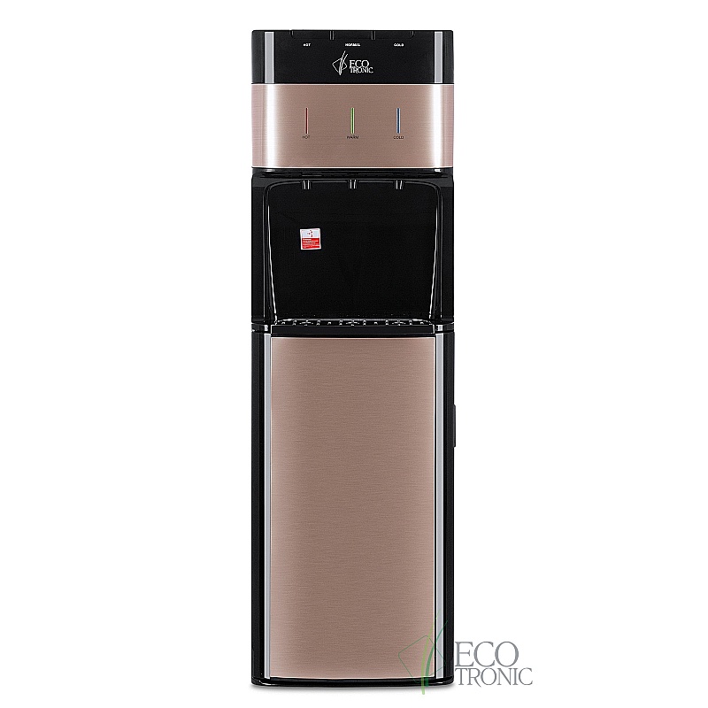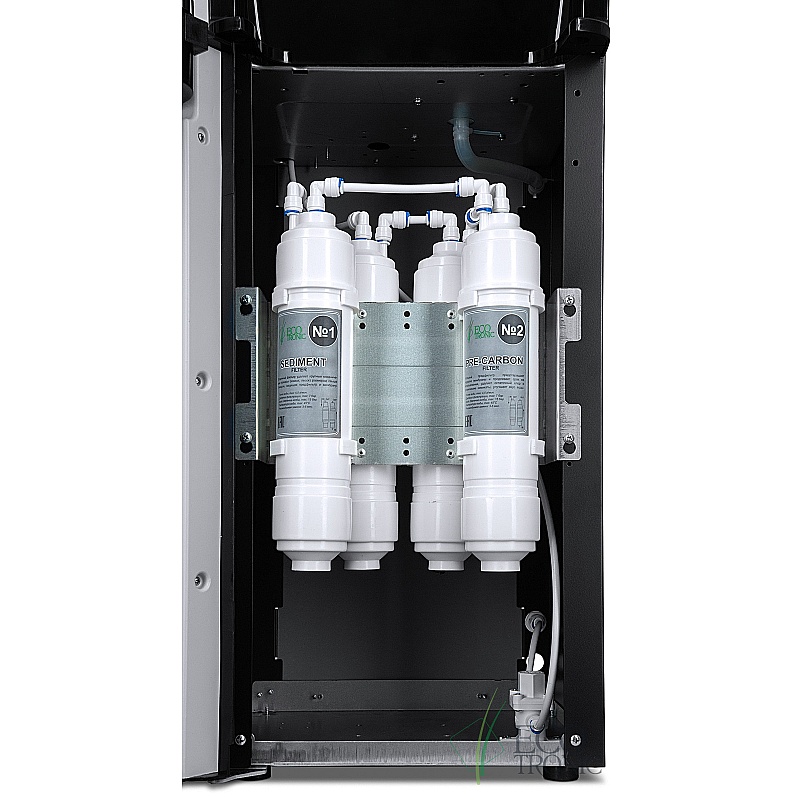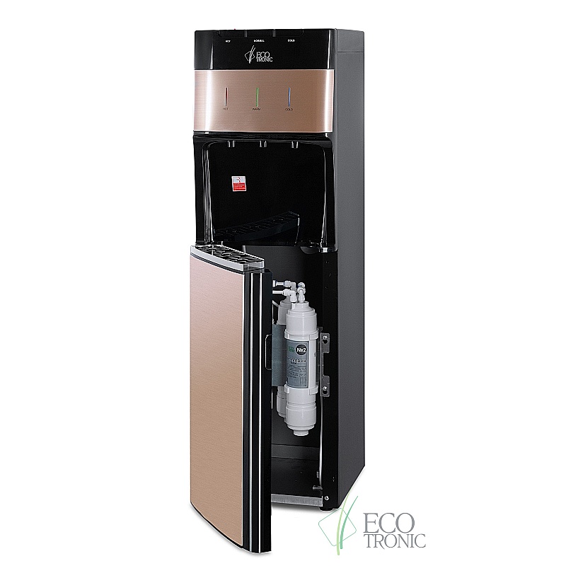 Пурифайер с системой очистки воды методом ультрафильтрации и электронным охлаждением. Корпус черного цвета со вставкой в золотых тонах. Три клавиши подачи воды: горячая/комнатной температуры/холодная. Защита от ошпаривания. Индикация режимов нагрева и охлаждения воды. Цельнотянутый безопасный бак холодной воды. Выключатели нагрева и охлаждения воды на задней панели. Изначально установлены фильтры U-типа 12". Возможно переоборудование аппарата 14" модулями I или U типа.