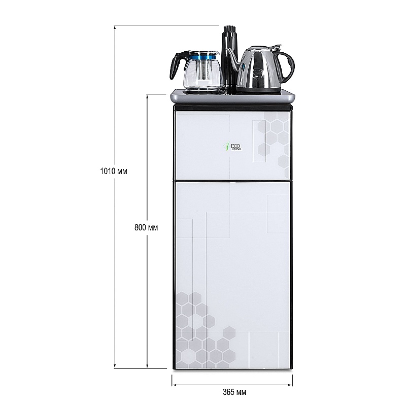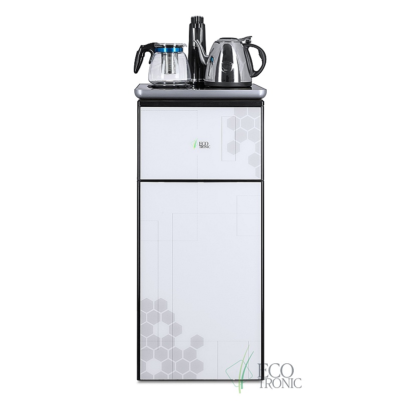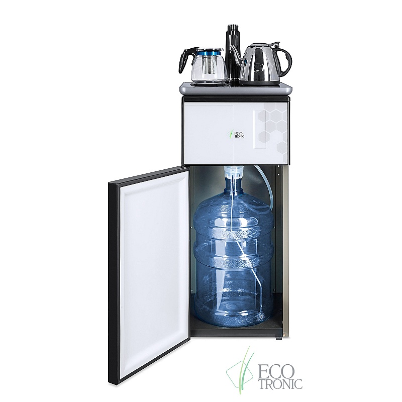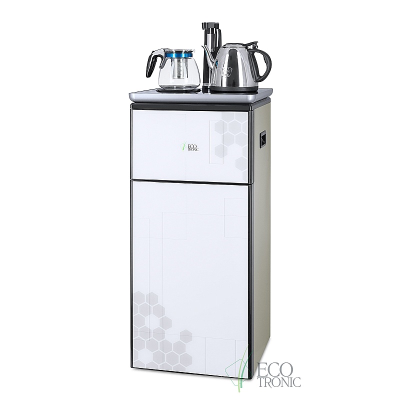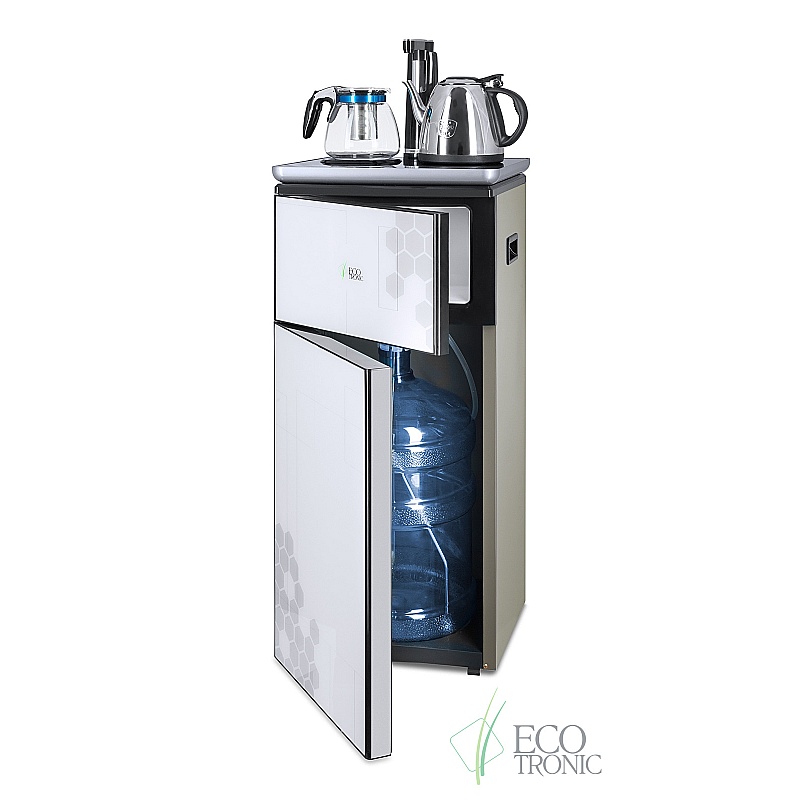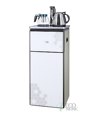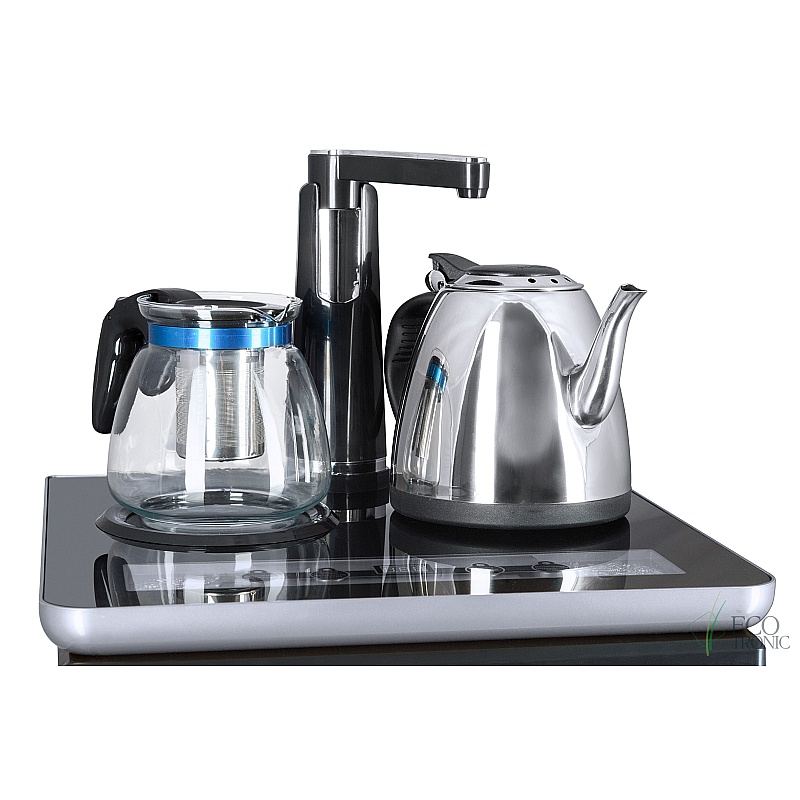 Модель с нижней загрузкой бутыли, подача воды в которой осуществляется посредством крана. Вода подается в два чайника: для кипячения и заварной. Заварной чайник устанавливается на поверхность для подогрева – кнопкой на панели управления можно включить постоянное поддержание подогрева на 6-8 часов. В обычном чайнике вода нагревается до 100°С, затем нагрев отключится. Температура воды отображается на дисплее. Если вода в чайнике остыла, можно не наполнять его заново, а включить нагрев соответствующей кнопкой.