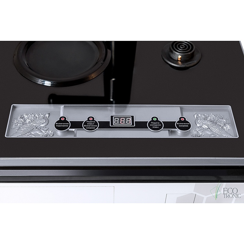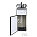 Охлаждение воды производится автоматически, включается тумблером на задней панели. Холодная вода подается из крана по нажатию кнопки "подача холодной воды". Также в конструкции предусмотрен шкафчик для хранения продуктов. Бутыль устанавливается на выкатную полку. О работе аппарата оповещает информационный дисплей сверху. Панель управления сенсорная, на русском языке. Корпус металлического цвета, передняя панель – белая, с серебристым декором. Поверхность чайного столика черная, по краям – серебристая. Панель управления также оформлена дизайнерскими узорами.