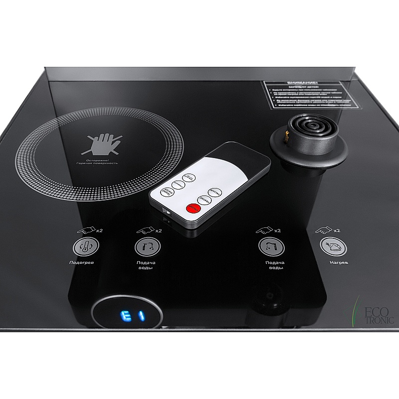 Пульт дистанционного управления. Нижняя загрузка бутыли. Два чайника – для кипячения (изотермический) и заварочный. Без охлаждения, только нагрев. Нагрев воды в чайнике до 100°С. Шкафчик для хранения.