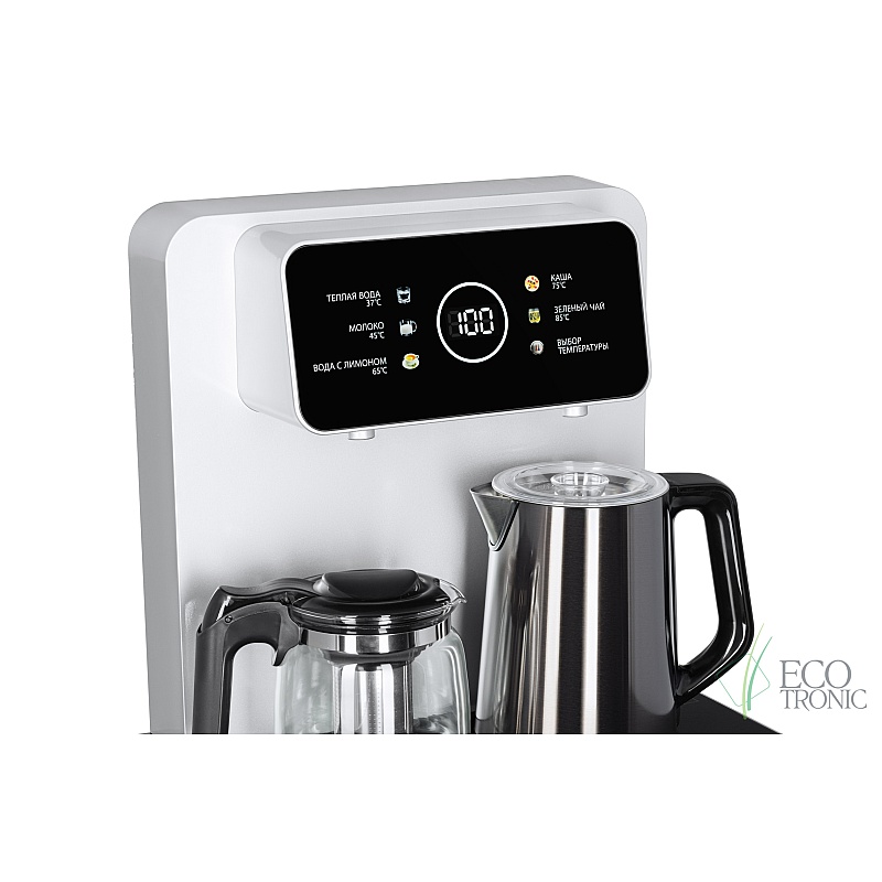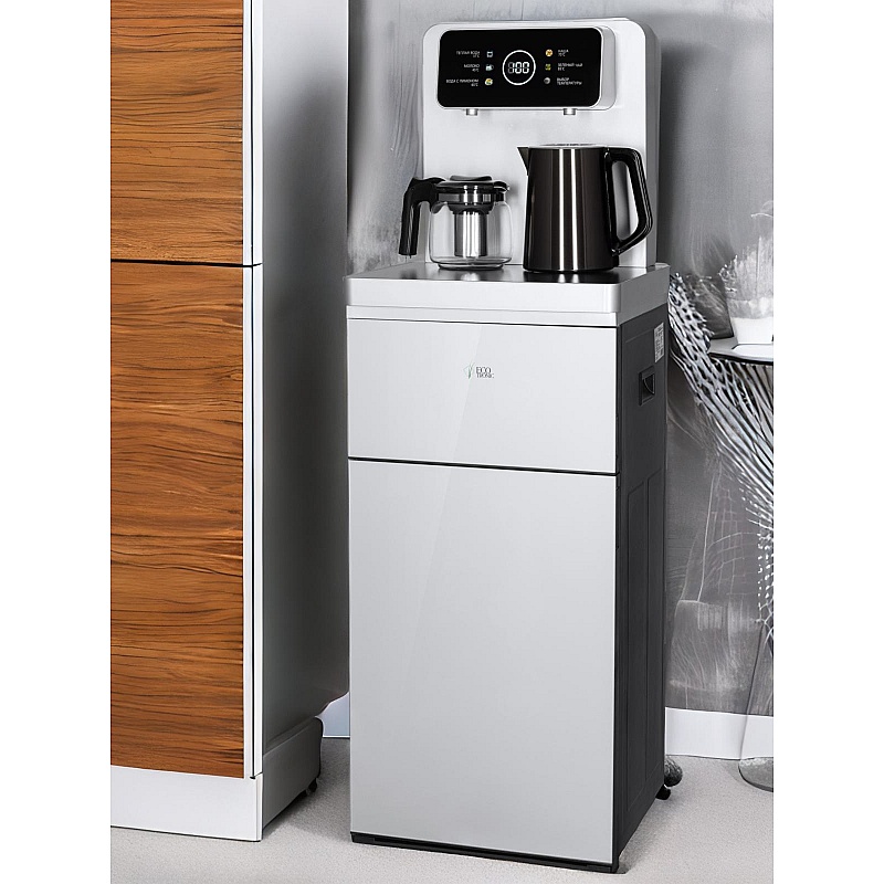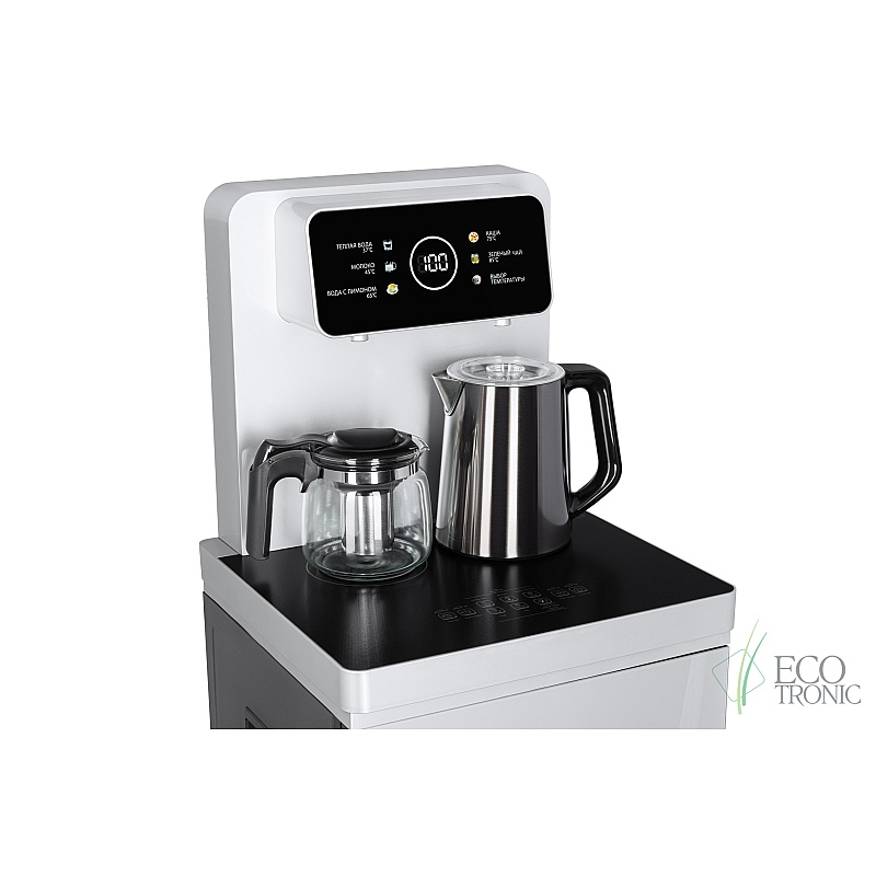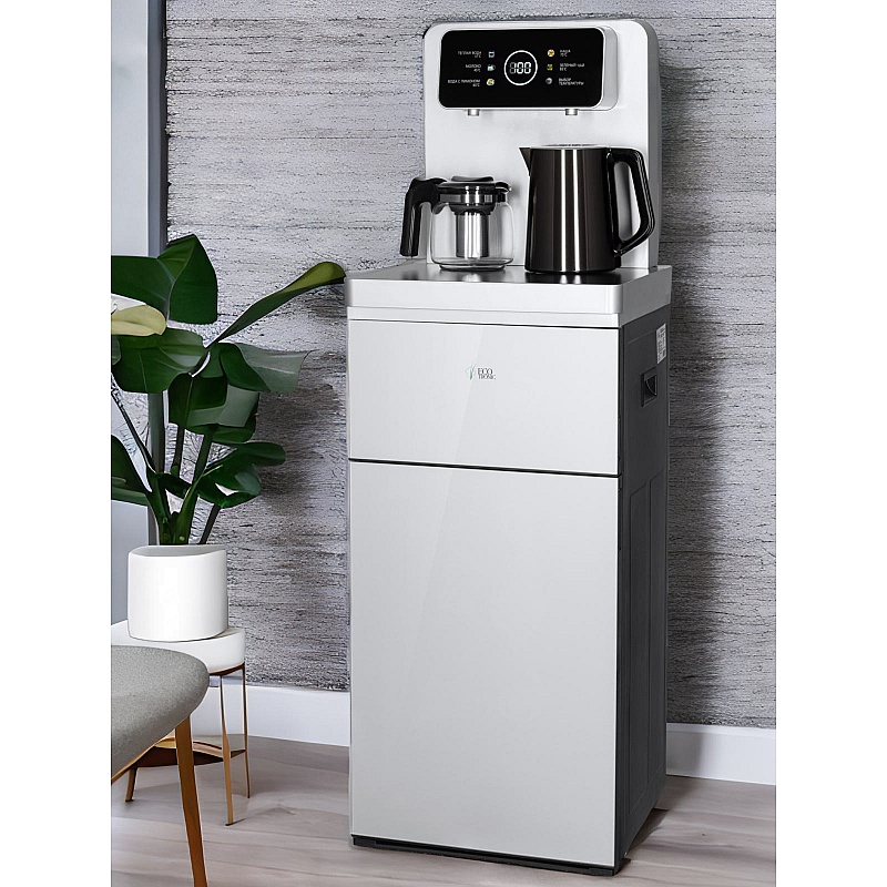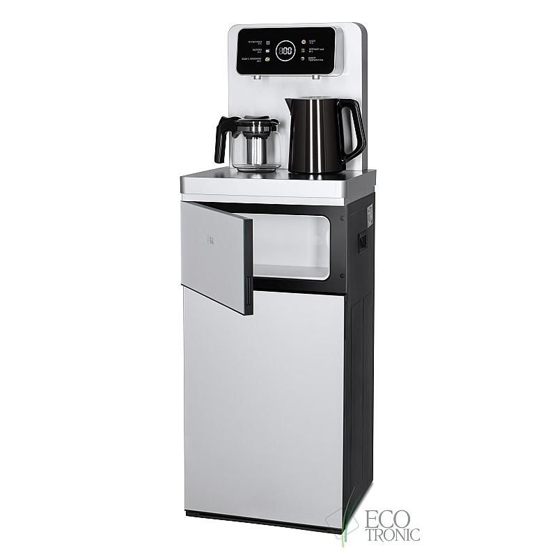 Удобная панель управления с возможностью задать температуру нагрева (5 режимов нагрева). Пульт дистанционного управления. Нижняя загрузка бутыли. Два чайника — для кипячения и заварочный. Без охлаждения, только нагрев и подача воды комнатной температуры. Нагрев воды в чайнике до 100°С. Шкафчик для хранения.