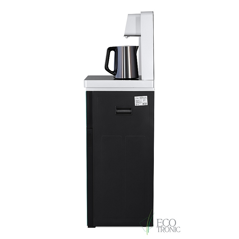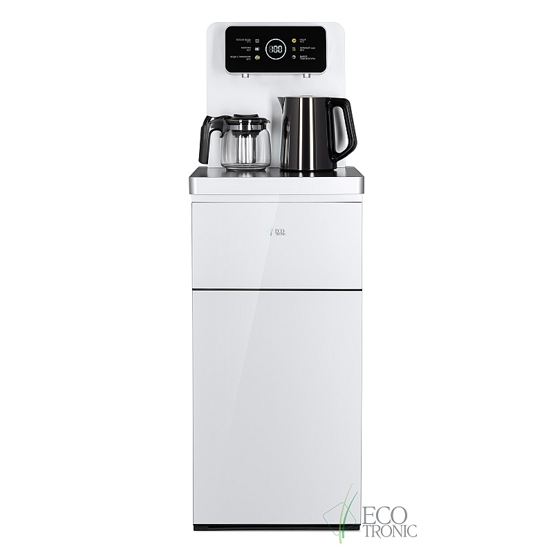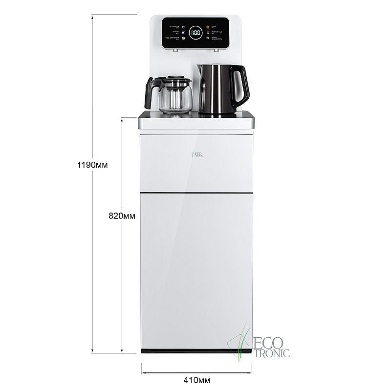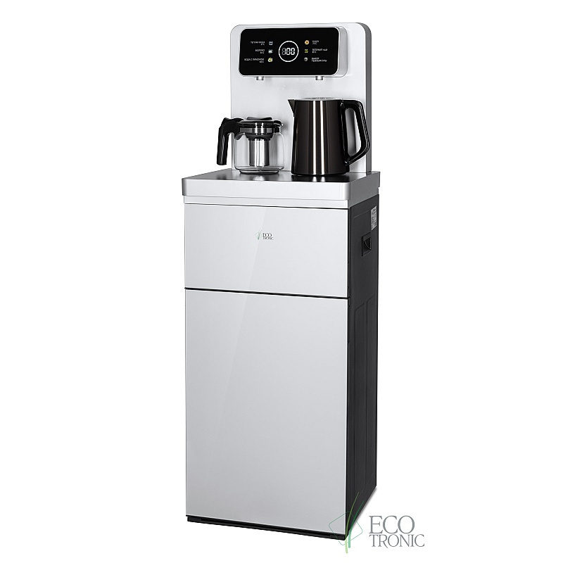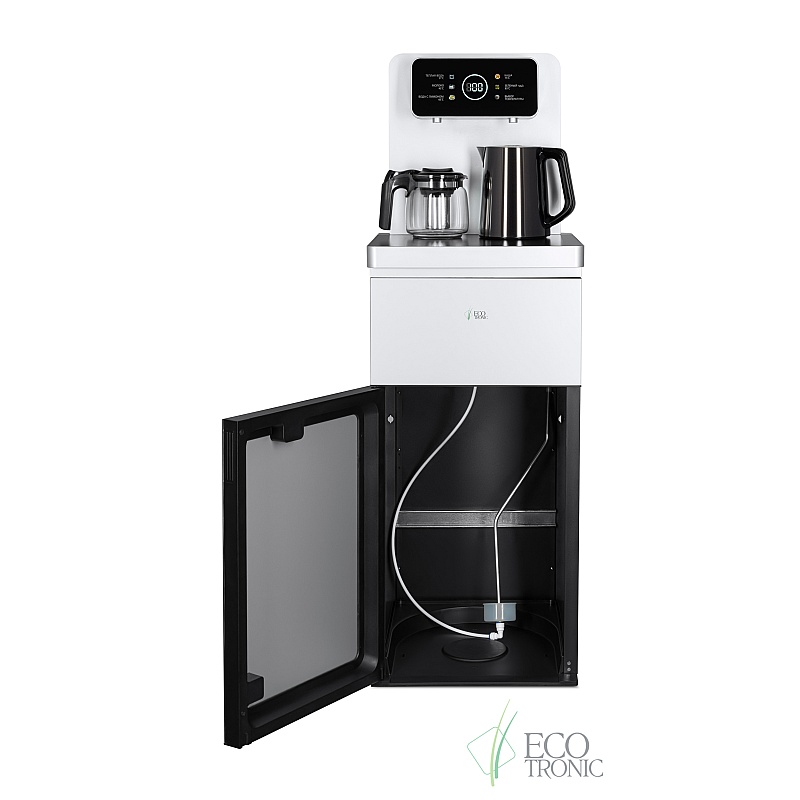 Удобная панель управления с возможностью задать температуру нагрева (5 режимов нагрева). Пульт дистанционного управления. Нижняя загрузка бутыли. Два чайника — для кипячения и заварочный. Без охлаждения, только нагрев и подача воды комнатной температуры. Нагрев воды в чайнике до 100°С. Шкафчик для хранения.