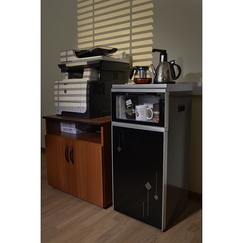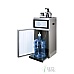 Охлаждение воды производится автоматически, включается тумблером на задней панели. Холодная вода подается из крана по нажатию кнопки "подача холодной воды". Также в конструкции предусмотрен шкафчик для хранения продуктов. Бутыль устанавливается на выкатную полку. Тип охлаждения – электронный. О работе аппарата оповещает информационный дисплей сверху. Панель управления сенсорная, на русском языке. Корпус металлического цвета, передняя панель – черная, с серебристым декором. Поверхность чайного столика черная.