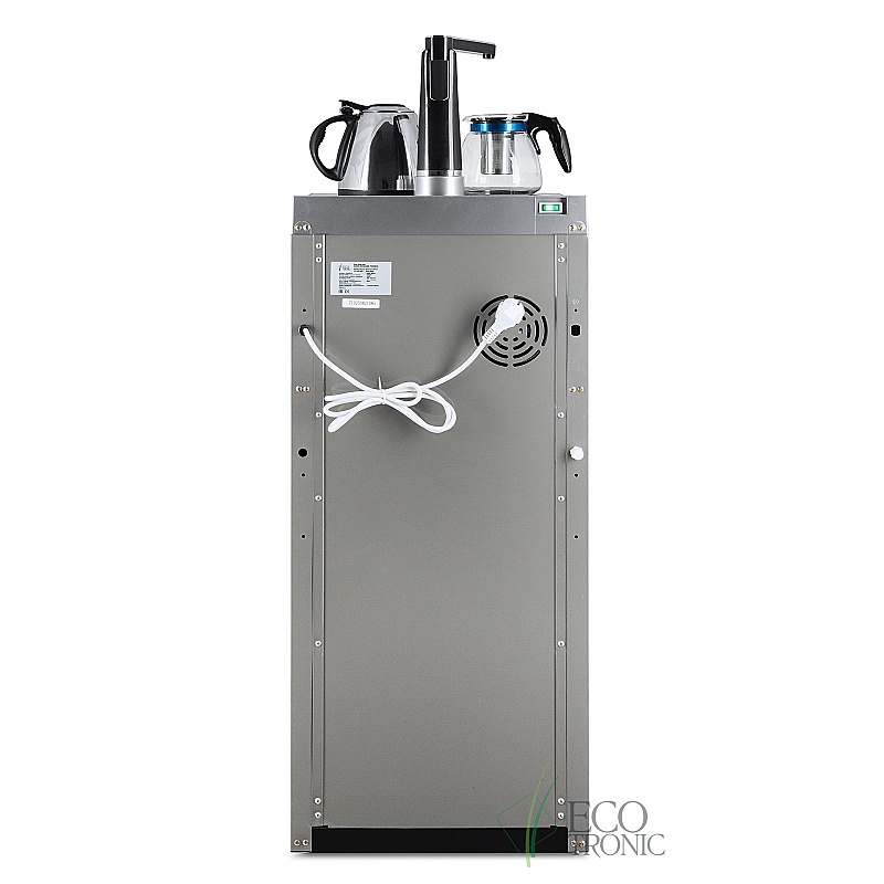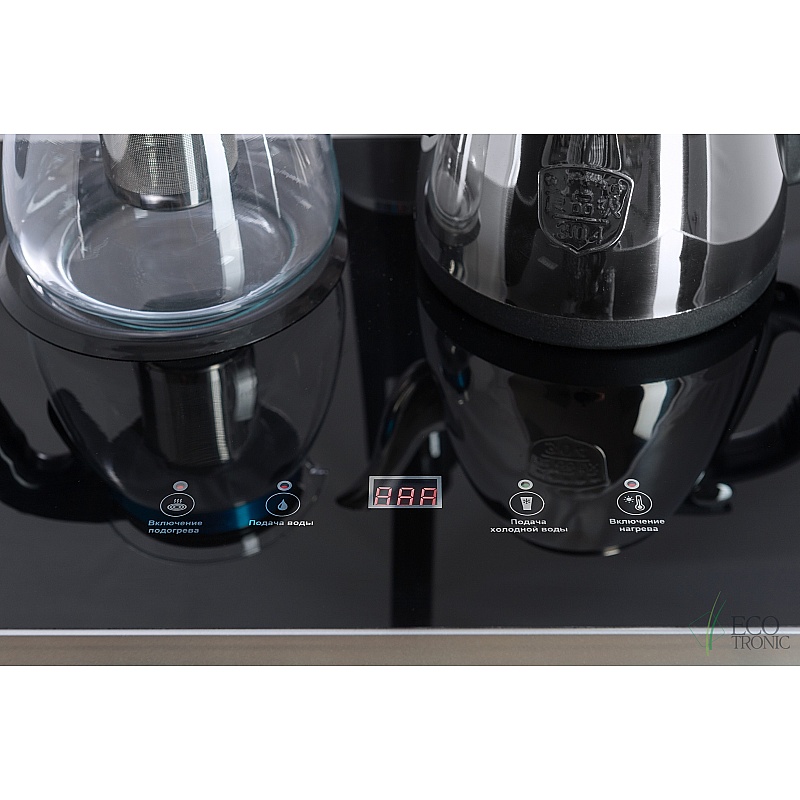 Модель с нижней загрузкой бутыли, подача воды в которой осуществляется посредством крана. Вода подается в два чайника: для кипячения и заварной. Заварной чайник устанавливается на поверхность для подогрева – кнопкой на панели управления можно включить постоянное поддержание подогрева на 6-8 часов. В обычном чайнике вода нагревается до 100°С, затем нагрев отключится. Температура воды отображается на дисплее. Если вода в чайнике остыла, можно не наполнять его заново, а включить нагрев соответствующей кнопкой.