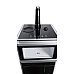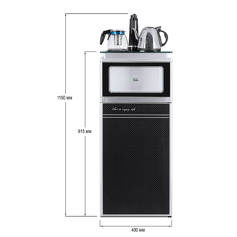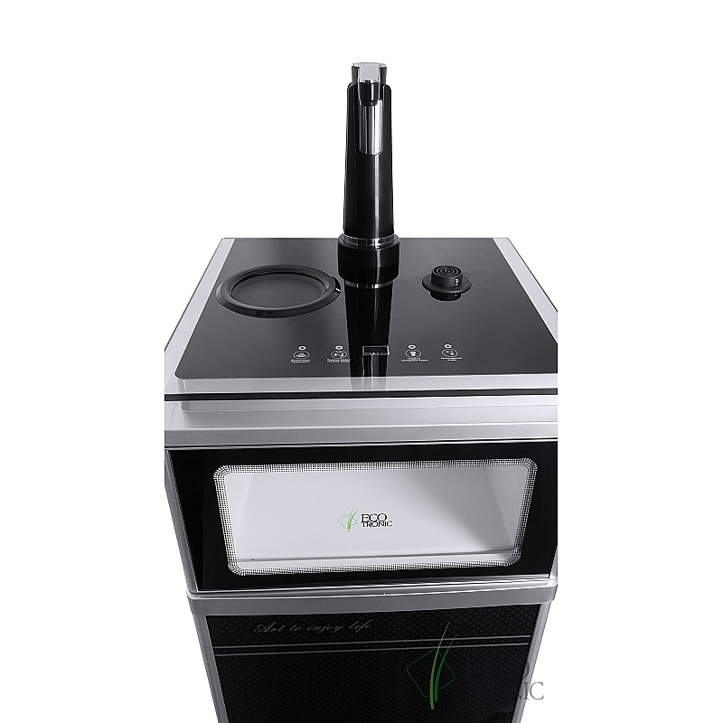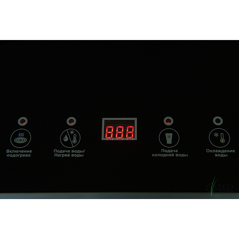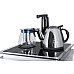 В обычном чайнике вода автоматически начинает нагреваться, как только подается в него из крана. Одновременно включается функция стерилизации воды в бутыли. Когда вода достигнет температуры 100°С, нагрев отключится. Температура воды отображается на дисплее. Если вода в чайнике остыла, можно не наполнять его заново, а включить нагрев двойным нажатием кнопки подачи воды. Отдельной кнопкой на панели включается охлаждение воды, после чего поддерживается автоматически, до принудительного отключения. Холодная вода подается из крана по нажатию кнопки "подача холодной воды". Также в конструкции предусмотрен шкафчик для хранения продуктов. Бутыль устанавливается на выкатную полку. Тип охлаждения – электронный. О работе аппарата оповещает информационный дисплей сверху. Панель управления сенсорная, на русском языке. Корпус металлического цвета, передняя панель – черная, с серебристым декором. Поверхность чайного столика из прозрачного стекла, визуально черного цвета.