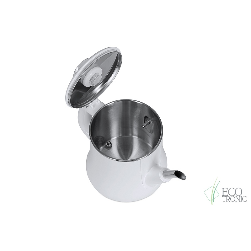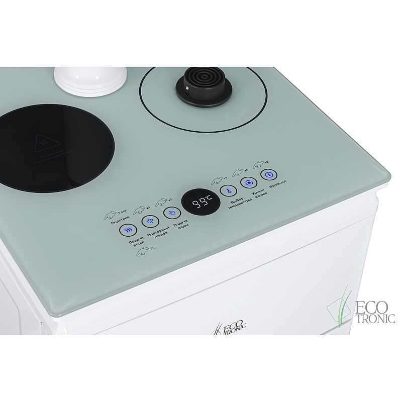 Два чайника в комплекте — для кипячения воды и заварочный чайник. Максимальная температура нагрева воды — 100 градусов C. Столешница изготовлена из закаленного стекла, а на ней расположена панель управления с сенсорным экраном и русскоязычным интерфейсом.