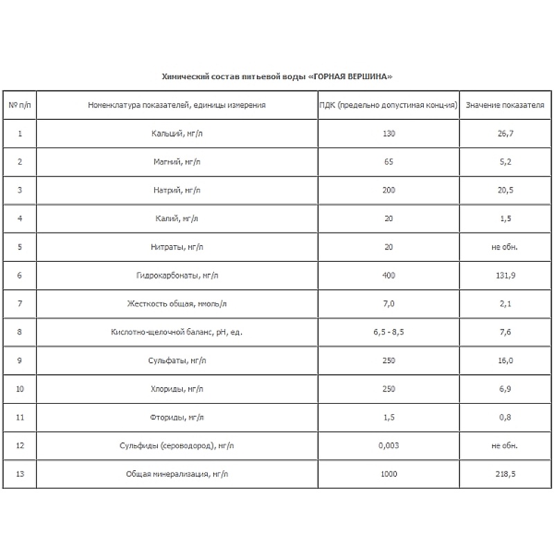 Питьевая вода «Горная Вершина» является особо пресной водой гидрокарбонатного натриево-кальциево состава и после бутилирования не теряет своих минеральных свойств. Также она обладает достаточно высокой стабильностью показателей микроэлементного состава.